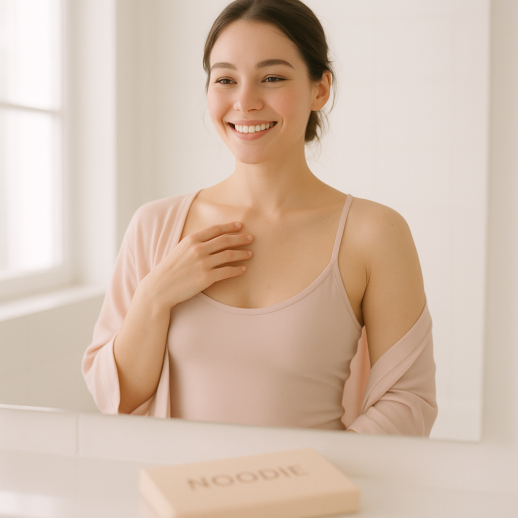 Fabriqué en silicone de grade médical, Noodie épouse ta peau en toute discrétion. Il est ultra-doux, adhère naturellement sans colles agressives, et reste en place du matin au soir.